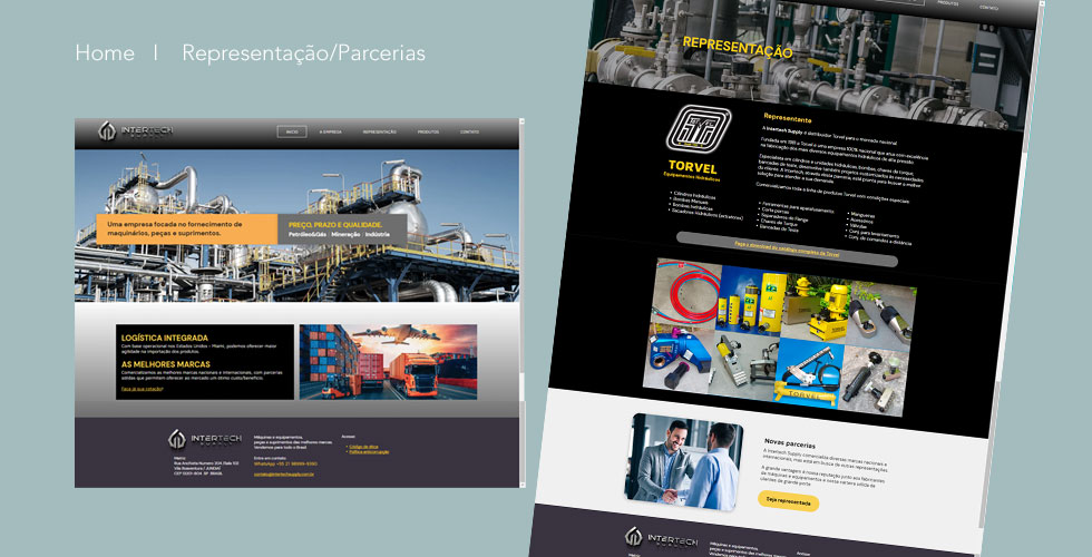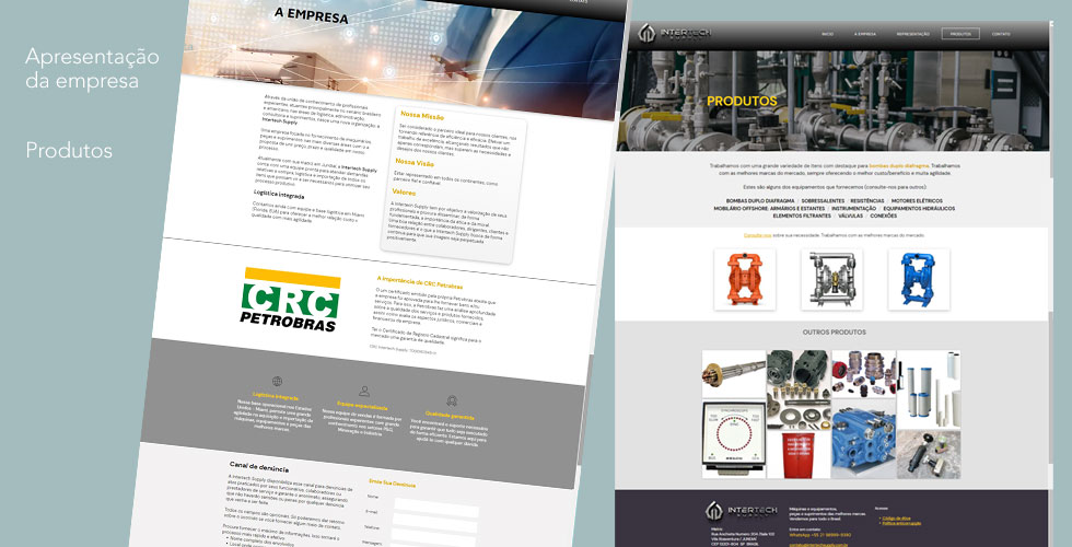Fornecedor qualificado da Petrobras, a Intertech atende diversos clientes de grande porte a partir de sua base operacional nos Estados Unidos. Este é o primeiro site da Intertech e tem o objetivo de apresentar a empresa ao mercado destacando os principais produtos e marcas que tabalha, possibilitar cotações e ser encontrada nos mecanismos de busca. Ele traz credibilidade para a empresa, oferecendo canais de contato. Também oferece canal para captar novas representações.