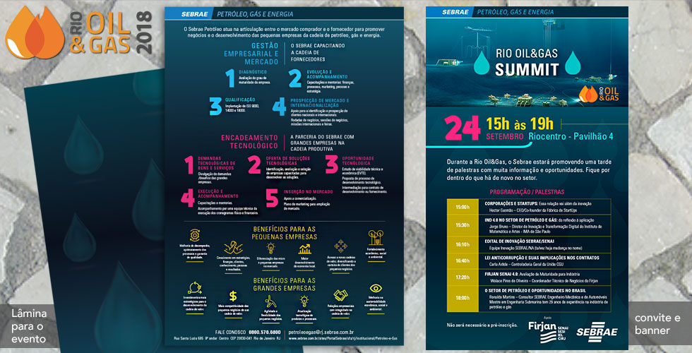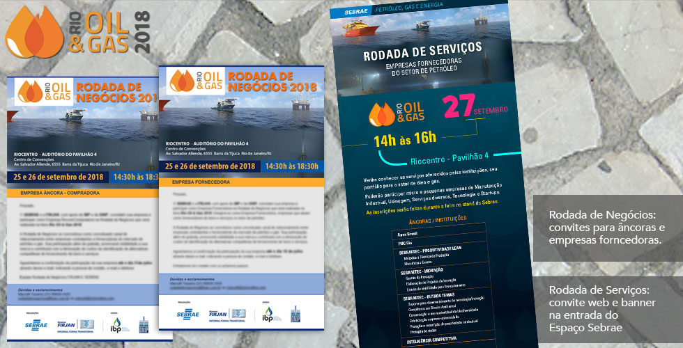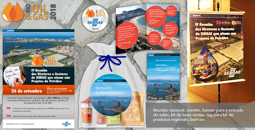 O Sebrae Petróleo do Rio de Janeiro participou ativamente da edição 2018 da feira Rio Oil&Gas, no Riocentro, de 24 a 27 de novembro de 2018. Com um espaço próprio, foram realizadas atividades especiais em todos os dias da feira. E a JAL Design deu todo o apoio criando as peças, produzindo materiais e dando suporte durante a feira.